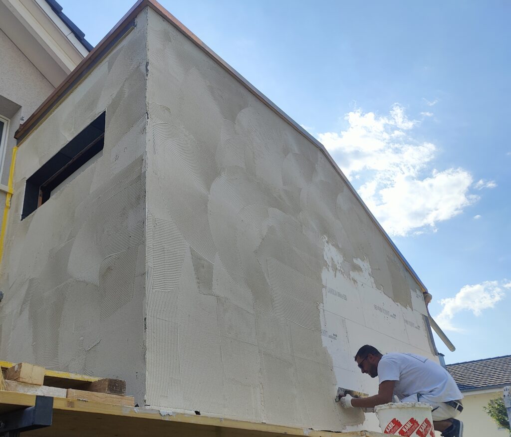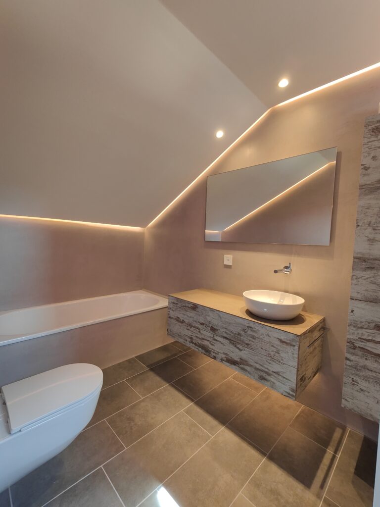 Durchgeführte Arbeiten: Abgehängte Decke, Isolation inkl. Dampfbremse, Fugenlose Wandbelege, Fassade inkl. Isolation, Vorsatzwände, Trennwand mit Nische, Einbau Schiebetüre